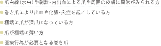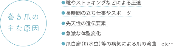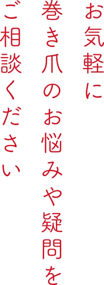 巻き爪によるトラブル改善のお手伝いをさせて頂きます。
